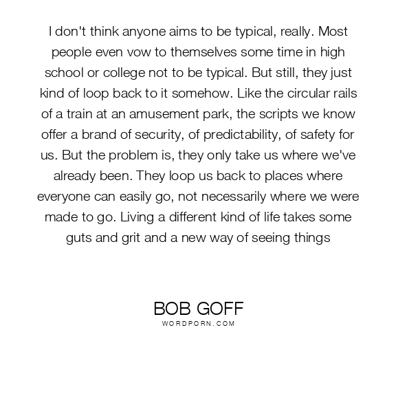 I don't think anyone aims to be typical, really. Most people even vow to themselves some time in high school or college not to be typical. But still, they just kind of loop back to it somehow. Like the circular rails of a train at an amusement park, the scripts we know offer a brand of security, of predictability, of safety for us. But the problem is, they only take us where we've already been. They loop us back to places where everyone can easily go, not necessarily where we were made to go. Living a different kind of life takes some guts and grit and a new way of seeing things