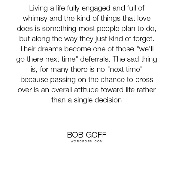 Living a life fully engaged and full of whimsy and the kind of things that love does is something most people plan to do, but along the way they just kind of forget. Their dreams become one of those "we'll go there next time" deferrals. The sad thing is, for many there is no "next time" because passing on the chance to cross over is an overall attitude toward life rather than a single decision