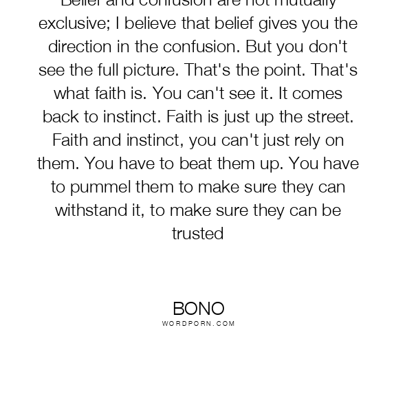 Belief and confusion are not mutually exclusive; I believe that belief gives you the direction in the confusion. But you don't see the full picture. That's the point. That's what faith is. You can't see it. It comes back to instinct. Faith is just up the street. Faith and instinct, you can't just rely on them. You have to beat them up. You have to pummel them to make sure they can withstand it, to make sure they can be trusted