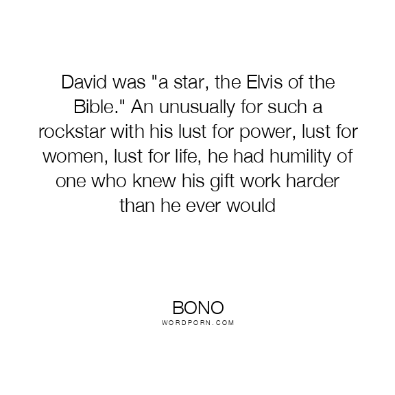 David was "a star, the Elvis of the Bible." An unusually for such a rockstar with his lust for power, lust for women, lust for life, he had humility of one who knew his gift work harder than he ever would