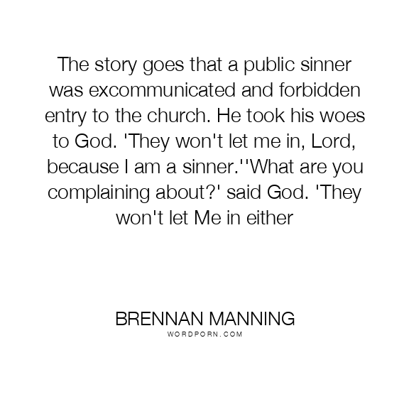 The story goes that a public sinner was excommunicated and forbidden entry to the church. He took his woes to God. 'They won't let me in, Lord, because I am a sinner.''What are you complaining about?' said God. 'They won't let Me in either