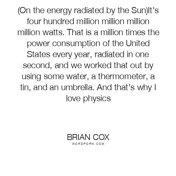 (On the energy radiated by the Sun)It's four hundred million million million million watts. That is a million times the power consumption of the United States every year, radiated in one second, and we worked that out by using some water, a thermometer, a tin, and an umbrella. And that's why I love physics