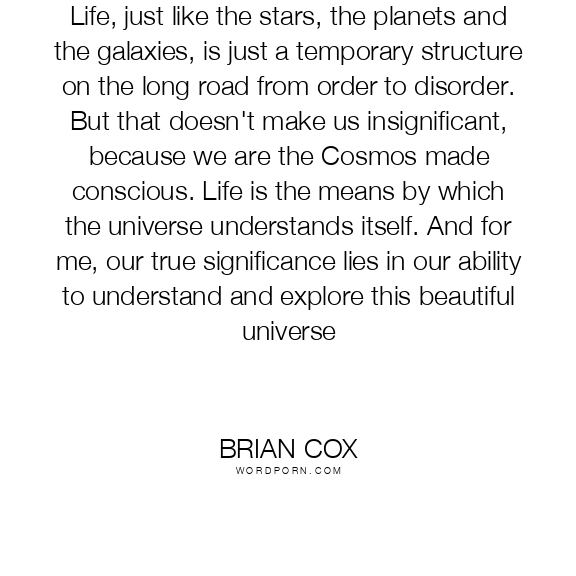 Life, just like the stars, the planets and the galaxies, is just a temporary structure on the long road from order to disorder. But that doesn't make us insignificant, because we are the Cosmos made conscious. Life is the means by which the universe understands itself. And for me, our true significance lies in our ability to understand and explore this beautiful universe
