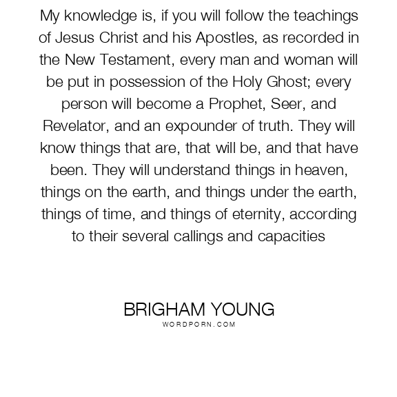 My knowledge is, if you will follow the teachings of Jesus Christ and his Apostles, as recorded in the New Testament, every man and woman will be put in possession of the Holy Ghost; every person will become a Prophet, Seer, and Revelator, and an expounder of truth. They will know things that are, that will be, and that have been. They will understand things in heaven, things on the earth, and things under the earth, things of time, and things of eternity, according to their several callings and capacities