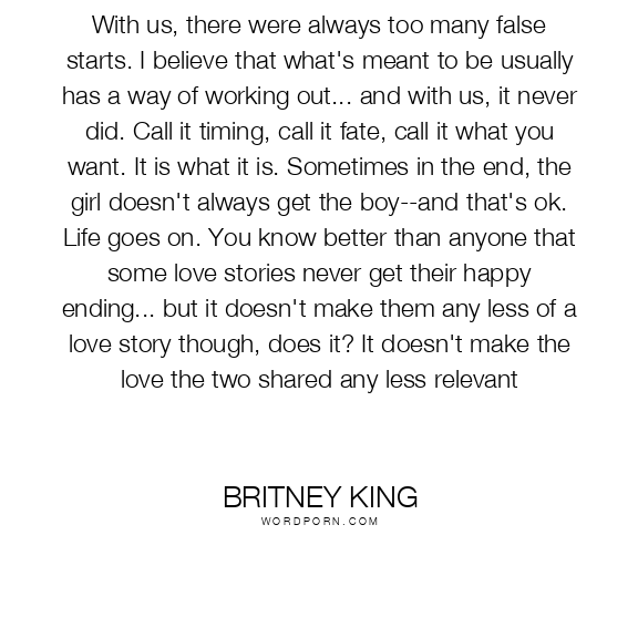 With us, there were always too many false starts. I believe that what's meant to be usually has a way of working out... and with us, it never did. Call it timing, call it fate, call it what you want. It is what it is. Sometimes in the end, the girl doesn't always get the boy--and that's ok. Life goes on. You know better than anyone that some love stories never get their happy ending... but it doesn't make them any less of a love story though, does it? It doesn't make the love the two shared any less relevant