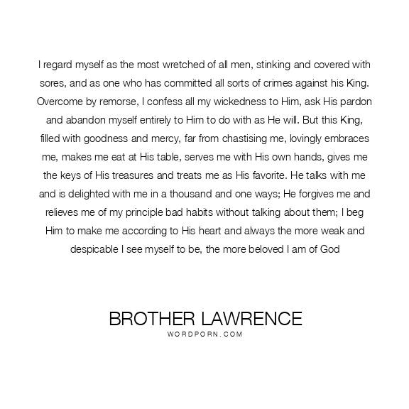 I regard myself as the most wretched of all men, stinking and covered with sores, and as one who has committed all sorts of crimes against his King. Overcome by remorse, I confess all my wickedness to Him, ask His pardon and abandon myself entirely to Him to do with as He will. But this King, filled with goodness and mercy, far from chastising me, lovingly embraces me, makes me eat at His table, serves me with His own hands, gives me the keys of His treasures and treats me as His favorite. He talks with me and is delighted with me in a thousand and one ways; He forgives me and relieves me of my principle bad habits without talking about them; I beg Him to make me according to His heart and always the more weak and despicable I see myself to be, the more beloved I am of God