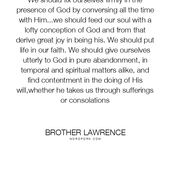We should fix ourselves firmly in the presence of God by conversing all the time with Him...we should feed our soul with a lofty conception of God and from that derive great joy in being his. We should put life in our faith. We should give ourselves utterly to God in pure abandonment, in temporal and spiritual matters alike, and find contentment in the doing of His will,whether he takes us through sufferings or consolations