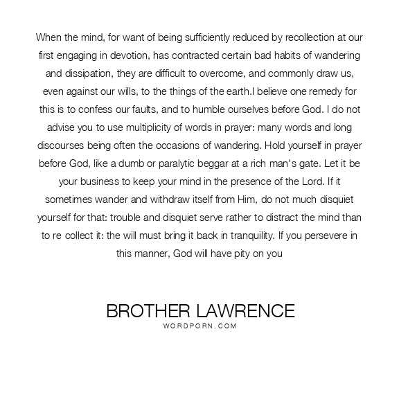 When the mind, for want of being sufficiently reduced by recollection at our first engaging in devotion, has contracted certain bad habits of wandering and dissipation, they are difficult to overcome, and commonly draw us, even against our wills, to the things of the earth.I believe one remedy for this is to confess our faults, and to humble ourselves before God. I do not advise you to use multiplicity of words in prayer: many words and long discourses being often the occasions of wandering. Hold yourself in prayer before God, like a dumb or paralytic beggar at a rich man's gate. Let it be your business to keep your mind in the presence of the Lord. If it sometimes wander and withdraw itself from Him, do not much disquiet yourself for that: trouble and disquiet serve rather to distract the mind than to re-collect it: the will must bring it back in tranquility. If you persevere in this manner, God will have pity on you