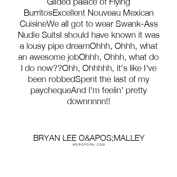 Gilded palace of Flying BurritosExcellent Nouveau Mexican CuisineWe all got to wear Swank-Ass Nudie SuitsI should have known it was a lousy pipe dreamOhhh, Ohhh, what an awesome jobOhhh, Ohhh, what do I do now??Ohh, Ohhhhh, it's like I've been robbedSpent the last of my paychequeAnd I'm feelin' pretty downnnnn!!