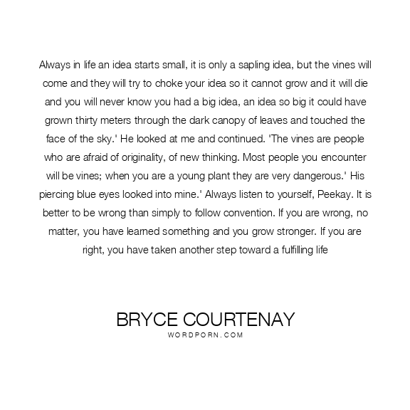 Always in life an idea starts small, it is only a sapling idea, but the vines will come and they will try to choke your idea so it cannot grow and it will die and you will never know you had a big idea, an idea so big it could have grown thirty meters through the dark canopy of leaves and touched the face of the sky.' He looked at me and continued. 'The vines are people who are afraid of originality, of new thinking. Most people you encounter will be vines; when you are a young plant they are very dangerous.' His piercing blue eyes looked into mine.' Always listen to yourself, Peekay. It is better to be wrong than simply to follow convention. If you are wrong, no matter, you have learned something and you grow stronger. If you are right, you have taken another step toward a fulfilling life