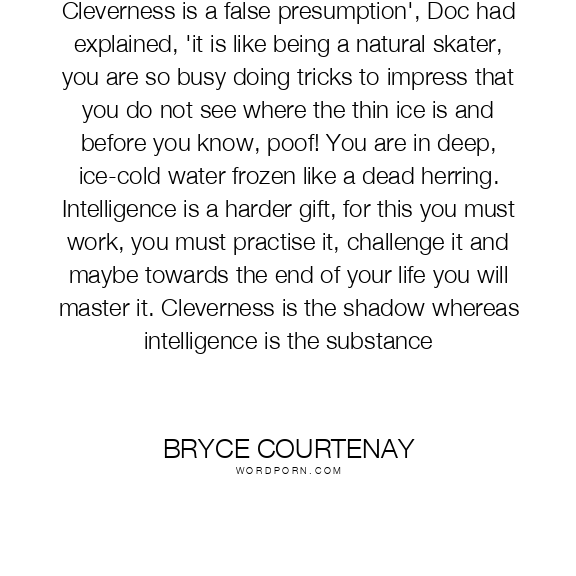 Cleverness is a false presumption', Doc had explained, 'it is like being a natural skater, you are so busy doing tricks to impress that you do not see where the thin ice is and before you know, poof! You are in deep, ice-cold water frozen like a dead herring. Intelligence is a harder gift, for this you must work, you must practise it, challenge it and maybe towards the end of your life you will master it. Cleverness is the shadow whereas intelligence is the substance