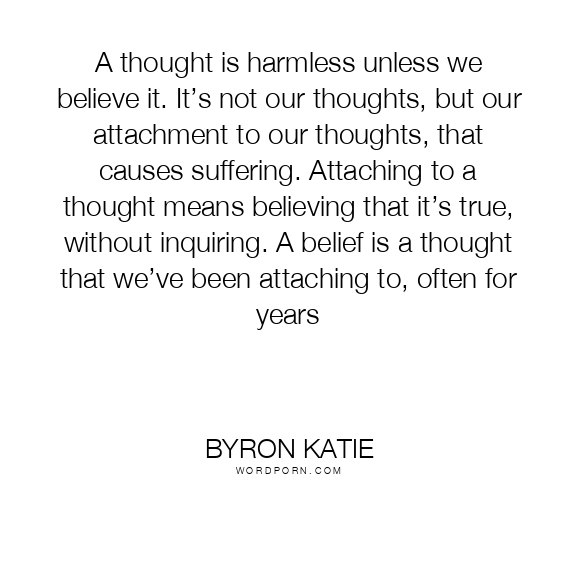 A thought is harmless unless we believe it. It’s not our thoughts, but our attachment to our thoughts, that causes suffering. Attaching to a thought means believing that it’s true, without inquiring. A belief is a thought that we’ve been attaching to, often for years