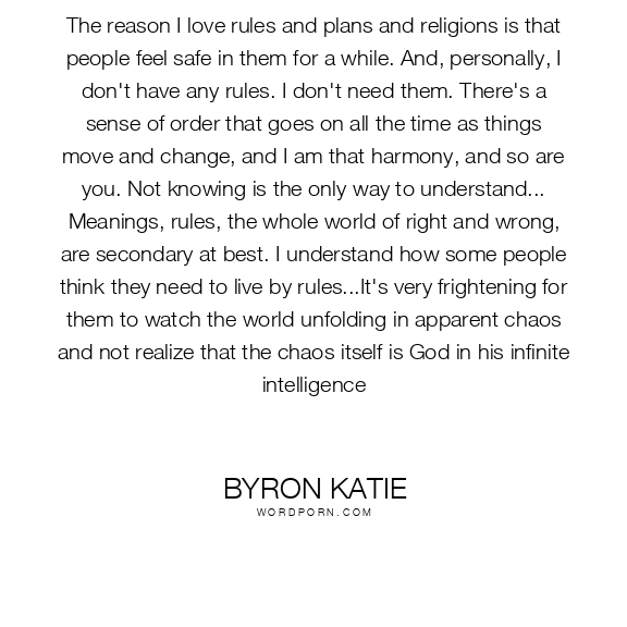 The reason I love rules and plans and religions is that people feel safe in them for a while. And, personally, I don't have any rules. I don't need them. There's a sense of order that goes on all the time as things move and change, and I am that harmony, and so are you. Not knowing is the only way to understand... Meanings, rules, the whole world of right and wrong, are secondary at best. I understand how some people think they need to live by rules...It's very frightening for them to watch the world unfolding in apparent chaos and not realize that the chaos itself is God in his infinite intelligence