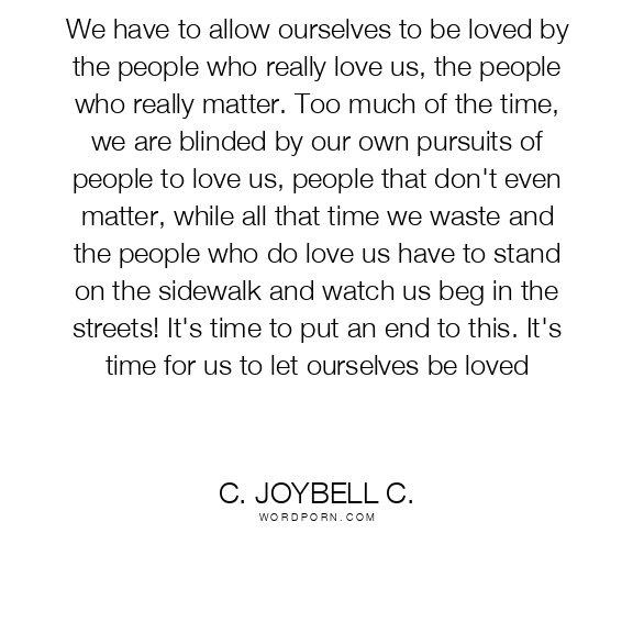 We have to allow ourselves to be loved by the people who really love us, the people who really matter. Too much of the time, we are blinded by our own pursuits of people to love us, people that don't even matter, while all that time we waste and the people who do love us have to stand on the sidewalk and watch us beg in the streets! It's time to put an end to this. It's time for us to let ourselves be loved