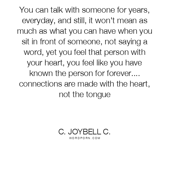You can talk with someone for years, everyday, and still, it won't mean as much as what you can have when you sit in front of someone, not saying a word, yet you feel that person with your heart, you feel like you have known the person for forever.... connections are made with the heart, not the tongue