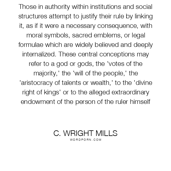 Those in authority within institutions and social structures attempt to justify their rule by linking it, as if it were a necessary consequence, with moral symbols, sacred emblems, or legal formulae which are widely believed and deeply internalized. These central conceptions may refer to a god or gods, the 'votes of the majority,' the 'will of the people,' the 'aristocracy of talents or wealth,' to the 'divine right of kings' or to the alleged extraordinary endowment of the person of the ruler himself