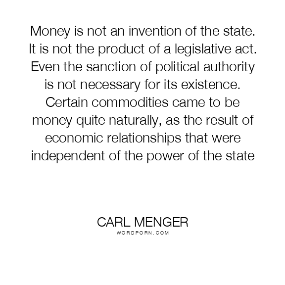 Money is not an invention of the state. It is not the product of a legislative act. Even the sanction of political authority is not necessary for its existence. Certain commodities came to be money quite naturally, as the result of economic relationships that were independent of the power of the state