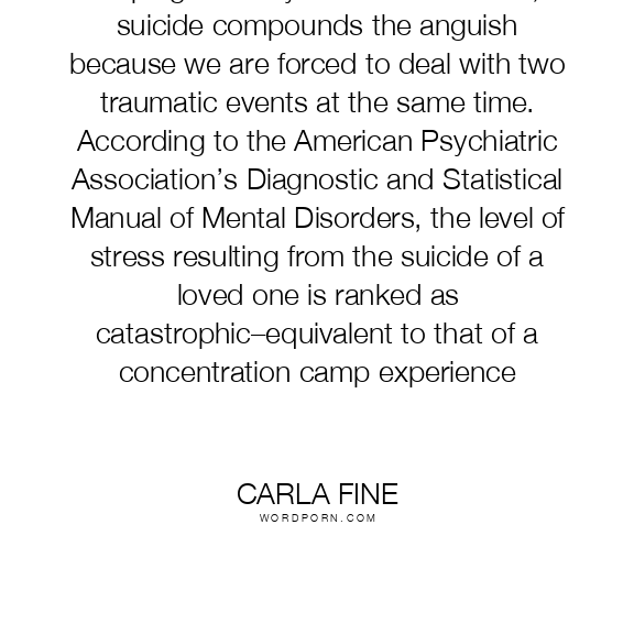 Coping with any death is traumatic; suicide compounds the anguish because we are forced to deal with two traumatic events at the same time. According to the American Psychiatric Association’s Diagnostic and Statistical Manual of Mental Disorders, the level of stress resulting from the suicide of a loved one is ranked as catastrophic–equivalent to that of a concentration camp experience