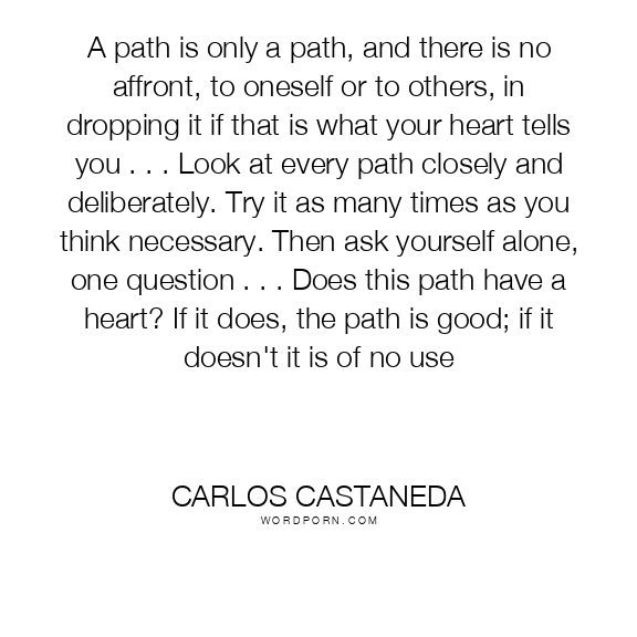 A path is only a path, and there is no affront, to oneself or to others, in dropping it if that is what your heart tells you . . . Look at every path closely and deliberately. Try it as many times as you think necessary. Then ask yourself alone, one question . . . Does this path have a heart? If it does, the path is good; if it doesn't it is of no use