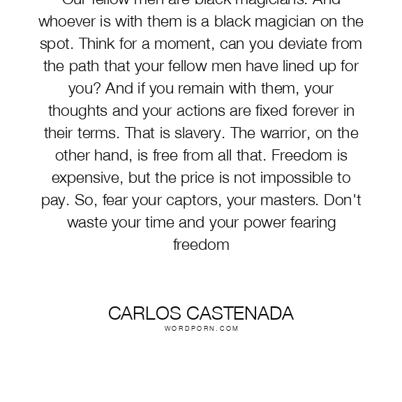 Our fellow men are black magicians. And whoever is with them is a black magician on the spot. Think for a moment, can you deviate from the path that your fellow men have lined up for you? And if you remain with them, your thoughts and your actions are fixed forever in their terms. That is slavery. The warrior, on the other hand, is free from all that. Freedom is expensive, but the price is not impossible to pay. So, fear your captors, your masters. Don't waste your time and your power fearing freedom