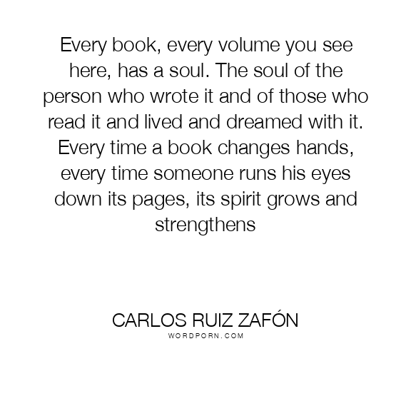 Every book, every volume you see here, has a soul. The soul of the person who wrote it and of those who read it and lived and dreamed with it. Every time a book changes hands, every time someone runs his eyes down its pages, its spirit grows and strengthens