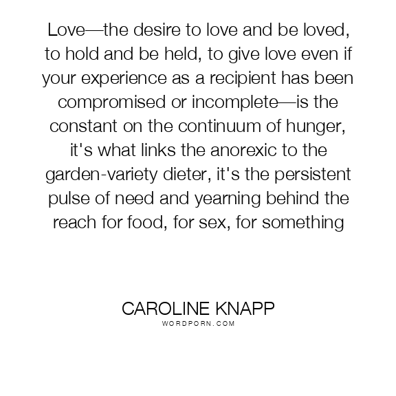 Love—the desire to love and be loved, to hold and be held, to give love even if your experience as a recipient has been compromised or incomplete—is the constant on the continuum of hunger, it's what links the anorexic to the garden-variety dieter, it's the persistent pulse of need and yearning behind the reach for food, for sex, for something
