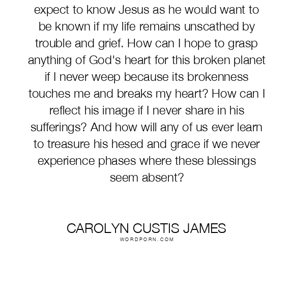 I have to ask myself how I can possibly expect to know Jesus as he would want to be known if my life remains unscathed by trouble and grief. How can I hope to grasp anything of God's heart for this broken planet if I never weep because its brokenness touches me and breaks my heart? How can I reflect his image if I never share in his sufferings? And how will any of us ever learn to treasure his hesed and grace if we never experience phases where these blessings seem absent?