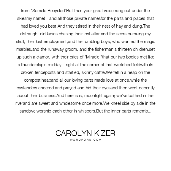 from "Semele Recycled"But then your great voice rang out under the skiesmy name!-- and all those private namesfor the parts and places that had loved you best.And they stirred in their nest of hay and dung.The distraught old ladies chasing their lost altar,and the seers pursuing my skull, their lost employment,and the tumbling boys, who wanted the magic marbles,and the runaway groom, and the fisherman's thirteen children,set up such a clamor, with their cries of "Miracle!"that our two bodies met like a thunderclapin midday-- right at the corner of that wretched fieldwith its broken fenceposts and startled, skinny cattle.We fell in a heap on the compost heapand all our loving parts made love at once,while the bystanders cheered and prayed and hid their eyesand then went decently about their business.And here is is, moonlight again; we've bathed in the riverand are sweet and wholesome once more.We kneel side by side in the sand;we worship each other in whispers.But the inner parts remember fermenting hay,the comfortable odor of dung, the animal incense,and passion, its bloody labor,its birth and rebirth and decay