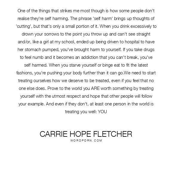 One of the things that strikes me most though is how some people don't realise they're self-harming. The phrase 'self-harm' brings up thoughts of 'cutting', but that's only a small portion of it. When you drink excessively to drown your sorrows to the point you throw up and can't see straight and/or, like a girl at my school, ended up being driven to hospital to have her stomach pumped, you've brought harm to yourself. If you take drugs to feel numb and it becomes an addiction that you can't break, you've self-harmed. When you starve yourself or binge eat to fit the latest fashions, you're pushing your body further than it can go.We need to start treating ourselves how we deserve to be treated, even if you feel that no one else does. Prove to the world you ARE worth something by treating yourself with the utmost respect and hope that other people will follow your example. And even if they don't, at least one person in the world is treating you well: YOU