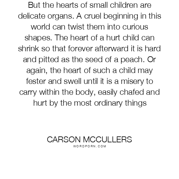 But the hearts of small children are delicate organs. A cruel beginning in this world can twist them into curious shapes. The heart of a hurt child can shrink so that forever afterward it is hard and pitted as the seed of a peach. Or again, the heart of such a child may fester and swell until it is a misery to carry within the body, easily chafed and hurt by the most ordinary things