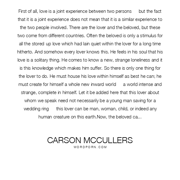 First of all, love is a joint experience between two persons — but the fact that it is a joint experience does not mean that it is a similar experience to the two people involved. There are the lover and the beloved, but these two come from different countries. Often the beloved is only a stimulus for all the stored-up love which had lain quiet within the lover for a long time hitherto. And somehow every lover knows this. He feels in his soul that his love is a solitary thing. He comes to know a new, strange loneliness and it is this knowledge which makes him suffer. So there is only one thing for the lover to do. He must house his love within himself as best he can; he must create for himself a whole new inward world — a world intense and strange, complete in himself. Let it be added here that this lover about whom we speak need not necessarily be a young man saving for a wedding ring — this lover can be man, woman, child, or indeed any human creature on this earth.Now, the beloved can also be of any description. The most outlandish people can be the stimulus for love. A man may be a doddering great-grandfather and still love only a strange girl he saw in the streets of Cheehaw one afternoon two decades past. The preacher may love a fallen woman. The beloved may be treacherous, greasy-headed, and given to evil habits. Yes, and the lover may see this as clearly as anyone else — but that does not affect the evolution of his love one whit. A most mediocre person can be the object of a love which is wild, extravagant, and beautiful as the poison lilies of the swamp. A good man may be the stimulus for a love both violent and debased, or a jabbering madman may bring about in the soul of someone a tender and simple idyll. Therefore, the value and quality of any love is determined solely by the lover himself.It is for this reason that most of us would rather love than be loved. Almost everyone wants to be the lover. And the curt truth is that, in a deep secret way, the state of being beloved is intolerable to many. The beloved fears and hates the lover, and with the best of reasons. For the lover is forever trying to strip bare his beloved. The lover craves any possible relation with the beloved, even if this experience can cause him only pain