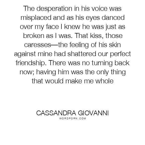 The desperation in his voice was misplaced and as his eyes danced over my face I knew he was just as broken as I was. That kiss, those caresses—the feeling of his skin against mine had shattered our perfect friendship. There was no turning back now; having him was the only thing that would make me whole