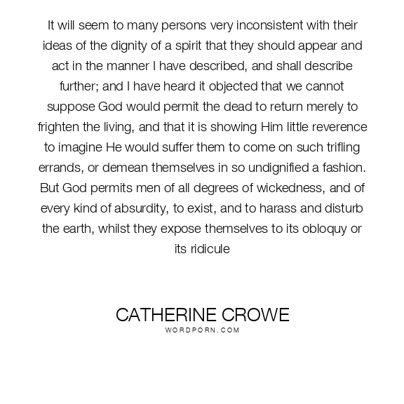 It will seem to many persons very inconsistent with their ideas of the dignity of a spirit that they should appear and act in the manner I have described, and shall describe further; and I have heard it objected that we cannot suppose God would permit the dead to return merely to frighten the living, and that it is showing Him little reverence to imagine He would suffer them to come on such trifling errands, or demean themselves in so undignified a fashion. But God permits men of all degrees of wickedness, and of every kind of absurdity, to exist, and to harass and disturb the earth, whilst they expose themselves to its obloquy or its ridicule