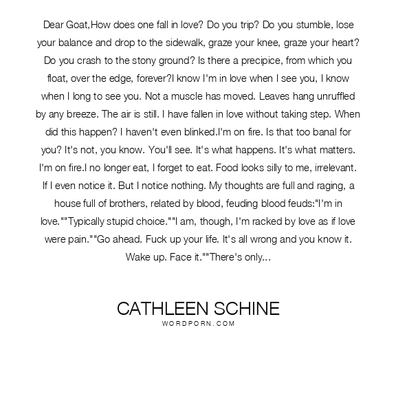 Dear Goat,How does one fall in love? Do you trip? Do you stumble, lose your balance and drop to the sidewalk, graze your knee, graze your heart? Do you crash to the stony ground? Is there a precipice, from which you float, over the edge, forever?I know I'm in love when I see you, I know when I long to see you. Not a muscle has moved. Leaves hang unruffled by any breeze. The air is still. I have fallen in love without taking step. When did this happen? I haven't even blinked.I'm on fire. Is that too banal for you? It's not, you know. You'll see. It's what happens. It's what matters. I'm on fire.I no longer eat, I forget to eat. Food looks silly to me, irrelevant. If I even notice it. But I notice nothing. My thoughts are full and raging, a house full of brothers, related by blood, feuding blood feuds:"I'm in love.""Typically stupid choice.""I am, though, I'm racked by love as if love were pain.""Go ahead. Fuck up your life. It's all wrong and you know it. Wake up. Face it.""There's only one face, it's all I see, awake or asleep."I threw the book out the window last night. I tried to forget. You are all wrong for me, I know it, but I no longer care for my thoughts unless they're thoughts of you. When I'm close to you, in your presence, I feel your hair brush my cheek when it does not. I look away from you, sometimes. Then I look back.When I tie my shoes, when I peel an orange, when I drive my car, when I lie down each night without you, I remain,As ever,Ram