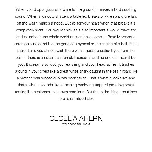 When you drop a glass or a plate to the ground it makes a loud crashing sound. When a window shatters a table leg breaks or when a picture falls off the wall it makes a noise. But as for your heart when that breaks it s completely silent. You would think as it s so important it would make the loudest noise in the whole world or even have some ... Read Moresort of ceremonious sound like the gong of a cymbal or the ringing of a bell. But it s silent and you almost wish there was a noise to distract you from the pain. If there is a noise it s internal. It screams and no one can hear it but you. It screams so loud your ears ring and your head aches. It trashes around in your chest like a great white shark caught in the sea it roars like a mother bear whose cub has been taken. That s what it looks like and that s what it sounds like a trashing panicking trapped great big beast roaring like a prisoner to its own emotions. But that s the thing about love no one is untouchable