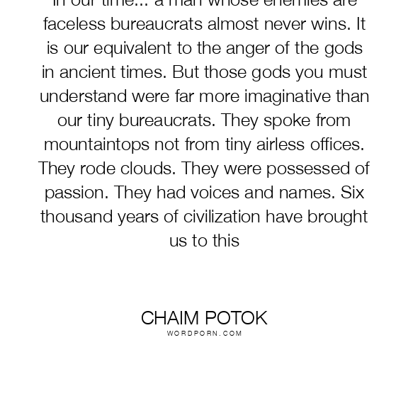 In our time... a man whose enemies are faceless bureaucrats almost never wins. It is our equivalent to the anger of the gods in ancient times. But those gods you must understand were far more imaginative than our tiny bureaucrats. They spoke from mountaintops not from tiny airless offices. They rode clouds. They were possessed of passion. They had voices and names. Six thousand years of civilization have brought us to this
