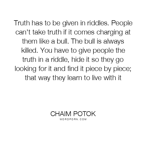 Truth has to be given in riddles. People can't take truth if it comes charging at them like a bull. The bull is always killed. You have to give people the truth in a riddle, hide it so they go looking for it and find it piece by piece; that way they learn to live with it