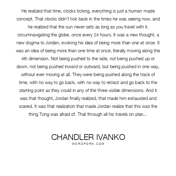 He realized that time, clocks ticking, everything is just a human-made concept. That clocks didn’t tick back in the times he was seeing now, and he realized that the sun never sets as long as you travel with it, circumnavigating the globe, once every 24 hours. It was a new thought, a new dogma to Jordan, evolving his idea of being more than one at once. It was an idea of being more than one time at once, literally moving along the 4th dimension. Not being pushed to the side, not being pushed up or down, not being pushed inward or outward, but being pushed in one way, without ever moving at all. They were being pushed along the track of time, with no way to go back, with no way to retract and go back to the starting point as they could in any of the three visible dimensions. And it was that thought, Jordan finally realized, that made him exhausted and scared. It was that realization that made Jordan realize that this was the thing Tong was afraid of. That through all his travels on planes and all his moving around the world, he could still go back to Bangkok, he could still go back to the hospital where he was born, but he could never go backward on that track and stand in the same place, only the same location, as where his first day began."-A Spontaneous Existence, Chandler Ivanko