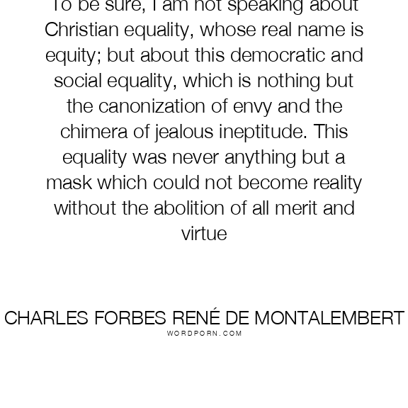 To be sure, I am not speaking about Christian equality, whose real name is equity; but about this democratic and social equality, which is nothing but the canonization of envy and the chimera of jealous ineptitude. This equality was never anything but a mask which could not become reality without the abolition of all merit and virtue