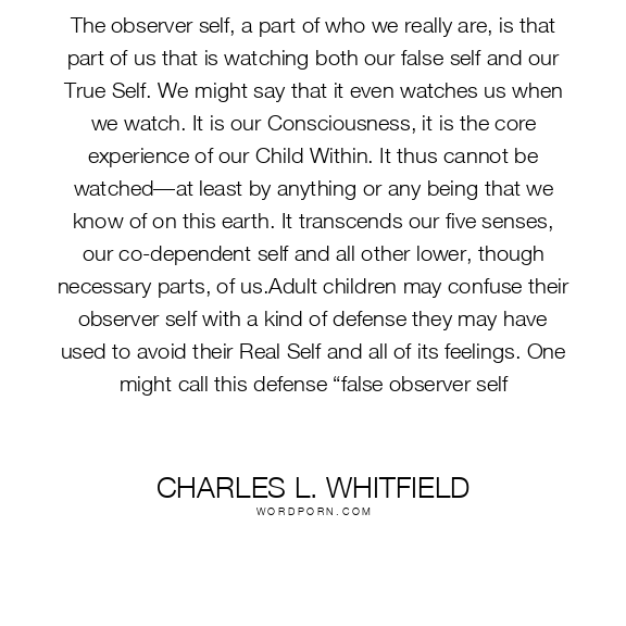 The observer self, a part of who we really are, is that part of us that is watching both our false self and our True Self. We might say that it even watches us when we watch. It is our Consciousness, it is the core experience of our Child Within. It thus cannot be watched—at least by anything or any being that we know of on this earth. It transcends our five senses, our co-dependent self and all other lower, though necessary parts, of us.Adult children may confuse their observer self with a kind of defense they may have used to avoid their Real Self and all of its feelings. One might call this defense “false observer self