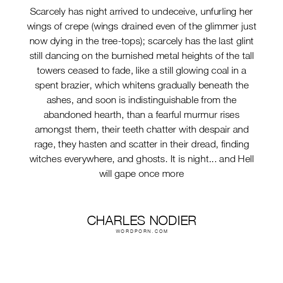 Scarcely has night arrived to undeceive, unfurling her wings of crepe (wings drained even of the glimmer just now dying in the tree-tops); scarcely has the last glint still dancing on the burnished metal heights of the tall towers ceased to fade, like a still glowing coal in a spent brazier, which whitens gradually beneath the ashes, and soon is indistinguishable from the abandoned hearth, than a fearful murmur rises amongst them, their teeth chatter with despair and rage, they hasten and scatter in their dread, finding witches everywhere, and ghosts. It is night... and Hell will gape once more