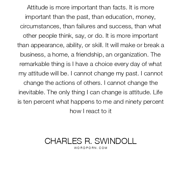Attitude is more important than facts. It is more important than the past, than education, money, circumstances, than failures and success, than what other people think, say, or do. It is more important than appearance, ability, or skill. It will make or break a business, a home, a friendship, an organization. The remarkable thing is I have a choice every day of what my attitude will be. I cannot change my past. I cannot change the actions of others. I cannot change the inevitable. The only thing I can change is attitude. Life is ten percent what happens to me and ninety percent how I react to it