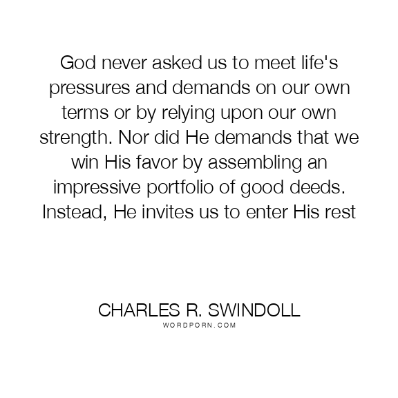God never asked us to meet life's pressures and demands on our own terms or by relying upon our own strength. Nor did He demands that we win His favor by assembling an impressive portfolio of good deeds. Instead, He invites us to enter His rest