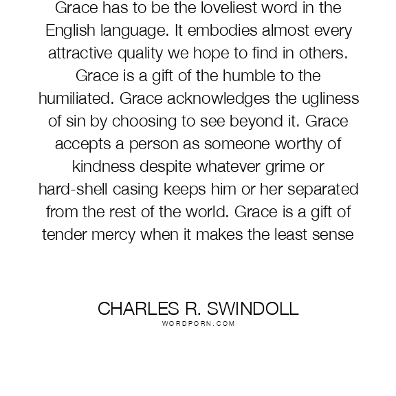 Grace has to be the loveliest word in the English language. It embodies almost every attractive quality we hope to find in others. Grace is a gift of the humble to the humiliated. Grace acknowledges the ugliness of sin by choosing to see beyond it. Grace accepts a person as someone worthy of kindness despite whatever grime or hard-shell casing keeps him or her separated from the rest of the world. Grace is a gift of tender mercy when it makes the least sense
