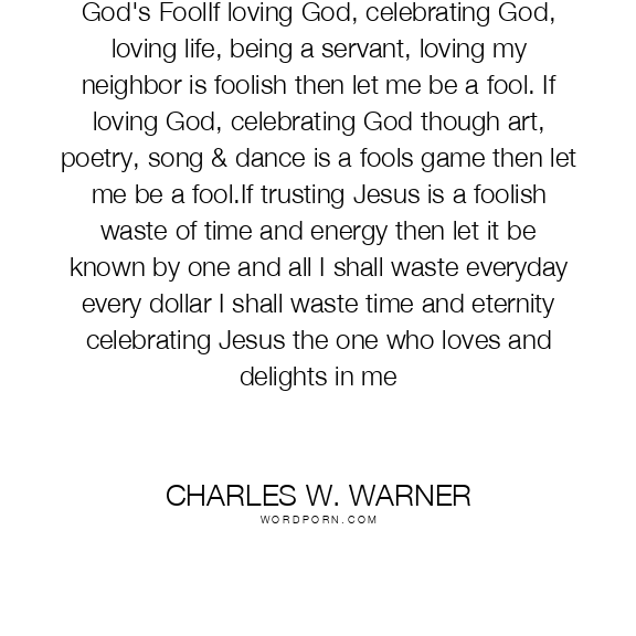 God's FoolIf loving God, celebrating God, loving life, being a servant, loving my neighbor is foolish then let me be a fool. If loving God, celebrating God though art, poetry, song & dance is a fools game then let me be a fool.If trusting Jesus is a foolish waste of time and energy then let it be known by one and all I shall waste everyday every dollar I shall waste time and eternity celebrating Jesus the one who loves and delights in me