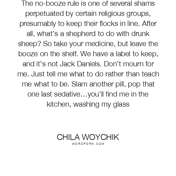 The no-booze rule is one of several shams perpetuated by certain religious groups, presumably to keep their flocks in line. After all, what’s a shepherd to do with drunk sheep? So take your medicine, but leave the booze on the shelf. We have a label to keep, and it’s not Jack Daniels. Don’t mourn for me. Just tell me what to do rather than teach me what to be. Slam another pill, pop that one last sedative…you’ll find me in the kitchen, washing my glass