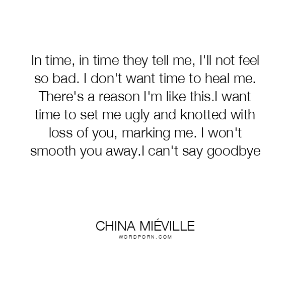 In time, in time they tell me, I'll not feel so bad. I don't want time to heal me. There's a reason I'm like this.I want time to set me ugly and knotted with loss of you, marking me. I won't smooth you away.I can't say goodbye