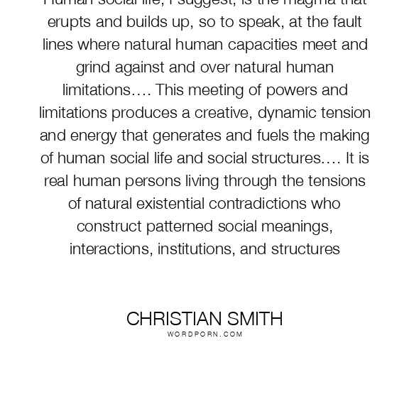 Human social life, I suggest, is the magma that erupts and builds up, so to speak, at the fault lines where natural human capacities meet and grind against and over natural human limitations…. This meeting of powers and limitations produces a creative, dynamic tension and energy that generates and fuels the making of human social life and social structures…. It is real human persons living through the tensions of natural existential contradictions who construct patterned social meanings, interactions, institutions, and structures