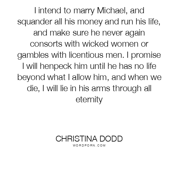 I intend to marry Michael, and squander all his money and run his life, and make sure he never again consorts with wicked women or gambles with licentious men. I promise I will henpeck him until he has no life beyond what I allow him, and when we die, I will lie in his arms through all eternity