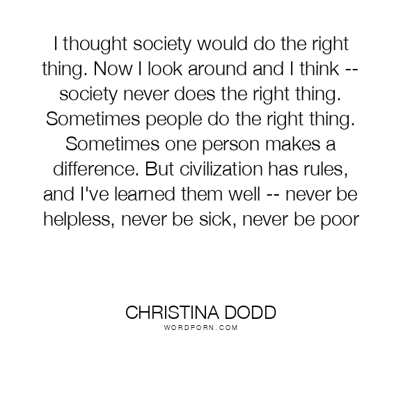 I thought society would do the right thing. Now I look around and I think -- society never does the right thing. Sometimes people do the right thing. Sometimes one person makes a difference. But civilization has rules, and I've learned them well -- never be helpless, never be sick, never be poor